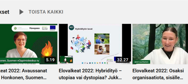 Suomen eOppimiskeskus ry:n Jukka Lehtoranta haastoi kuulijoita miettimään hybridityöhön liitettyjä ennakkokäsityksiä, mielikuvia, mahdollisuuksia ja haasteita. Elovalkeiden osallistujista suurin osa koki hybridityön sopivan itselleen, näki hybridityön kustannustehokkaana ja työhyvinvointia parantavana työtapana. Toisaalta osallistujat ilmaisivat huolensa yhteisöllisyyden puutteesta, yrityskulttuurin rakentamisesta sekä itsensä johtamisen vaikeudesta.