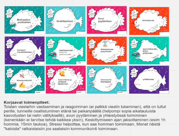 Opiskelijat arvioivat työskentelyn puolivälissä tiimin toimivuutta käyttäen Stinky Fish -menetelmää ja tekevät sen pohjalta korjaavat toimenpiteet. Valmiin pohjan löydät Miro-työkalun Miroversestä, jota opiskelijat ovat käyttäneet alla olevassa esimerkissä.