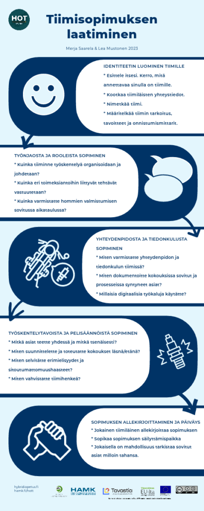 Käytä tiimisopimusta opiskelijoiden yhteisöllisen työskentelyn jäntevöittämiseen. Jokainen allekirjoittaa tiimisopimuksen. Tiimisopimuksen toimivuutta ja pelisääntöjen päivitystarvetta opiskelijat voivat arvioida työskentelyn puolivälissä Stinky Fish -menetelmällä.